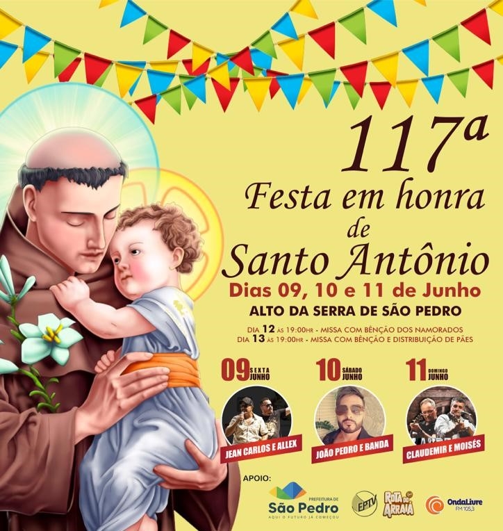 A Festa de Santo Antônio será realizada nos dias 9, 10 e 11 de junho. A programação será composta por: quermesse, shows regionais, bênção do bolo e do pão de Santo Antônio, procissão e levantamento do mastro. A tradicional festa em louvor a Santo Antônio é realizada pela comunidade do alto da serra de São Pedro.